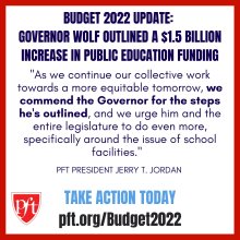 Click here to read PFT president Jerry Jordan's statement on Governor Wolf's 2022 Budget.