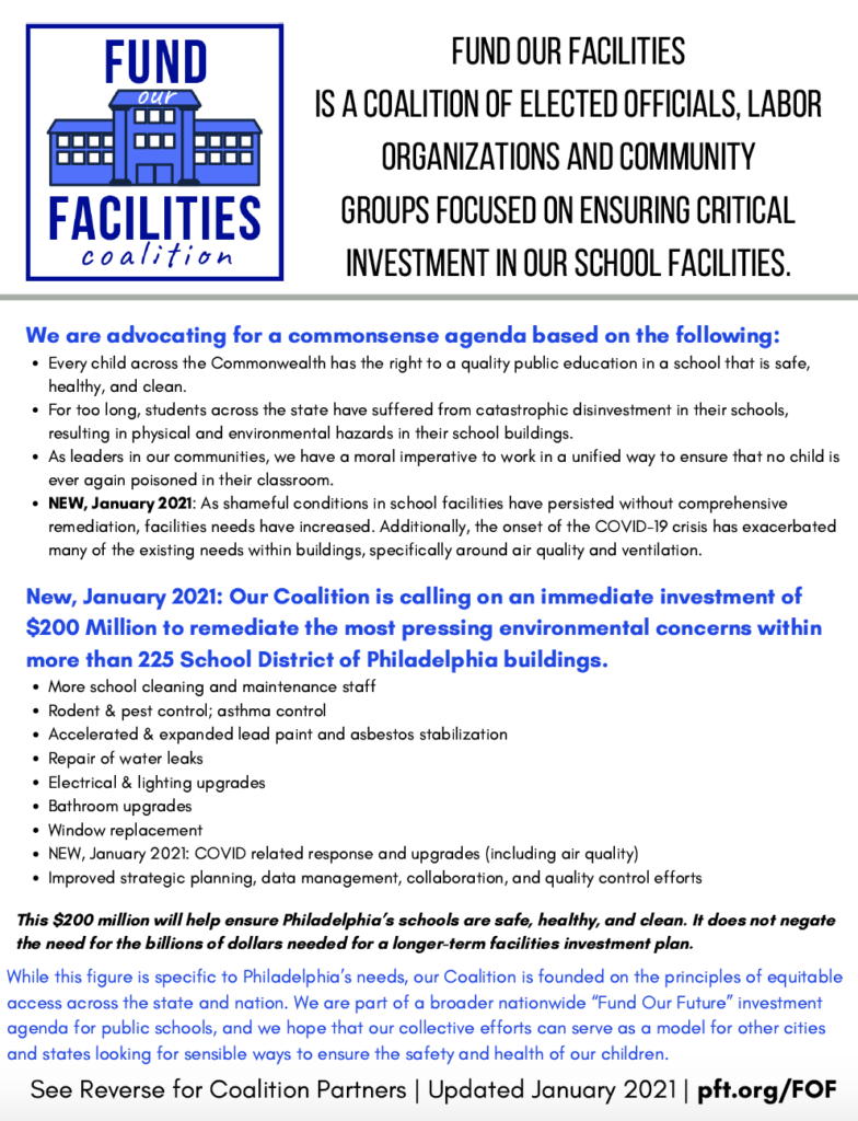 New, January 2021: Our Coalition is calling for an immediate investment of $200 Million to remediate the most pressing environmental concerns within more than 225 School District of Philadelphia buildings.