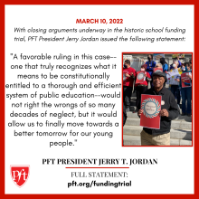 "From day one, the PFT has supported this lawsuit and in fact filed an amicus brief outlining the ways in which our students are denied their constitutional right to a thorough and efficient system of public education.