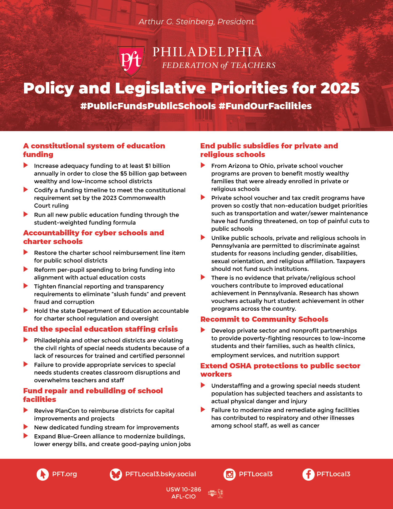 The PFT calls on legislators at all levels of government to commit to and prioritize an investment agenda that is laser-focused on ensuring that the urgent needs of our young people are met.